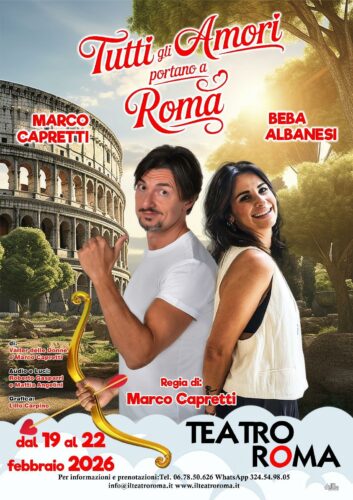 Tutti gli amori portano a Roma” non è solo una pièce teatrale, ma un’esperienza divulgativa e spassosa. In due ore di spettacolo, il pubblico viene letteralmente “rapito” dagli umori e dallo spirito inconfondibile dei romani. Tra gag, aneddoti storici inediti e canzoni, lo spettacolo celebra Roma come Caput Mundi del sentimento. Uno spettacolo che combina la risata di pancia all’emozione del cuore, con la coppia Capretti-Albanesi a rendersi complice e partecipe con il pubblico. Perché, in fondo, come dice il titolo, tutte le strade, e soprattutto tutti gli amori, non possono che finire a Roma.